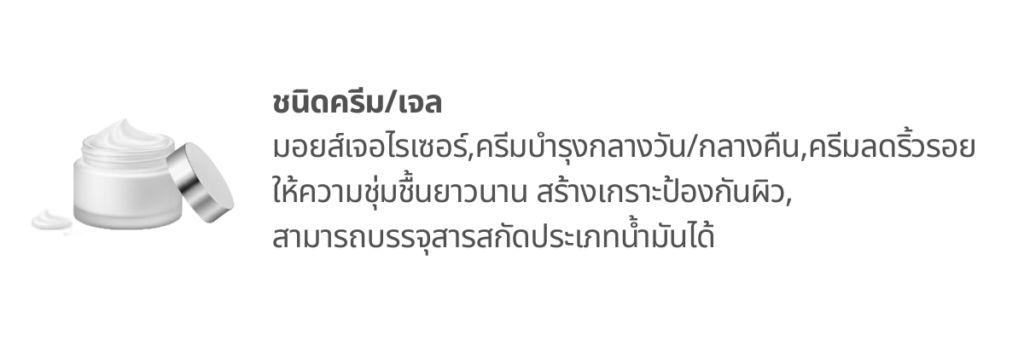 •รวมสารละลายน้ำได้ดี: สามารถรวมสารสำคัญที่ละลายน้ำ ไว้ด้วยกันได้อย่างลงตัว